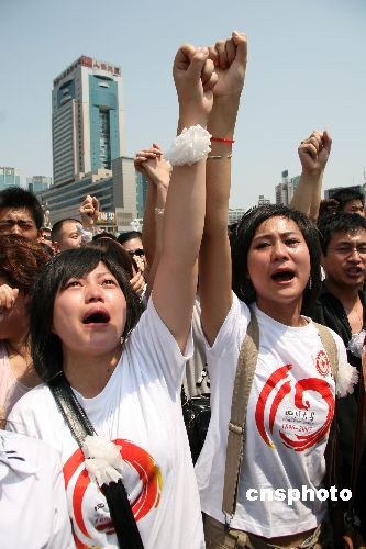 5月19日14時(shí)28分,成都天府廣場(chǎng),數(shù)以萬(wàn)計(jì)的民眾自發(fā)聚集在一起默哀,為在四川汶川地震中遇難的同胞哀悼、祈禱,之后,萬(wàn)人高喊“雄起”!