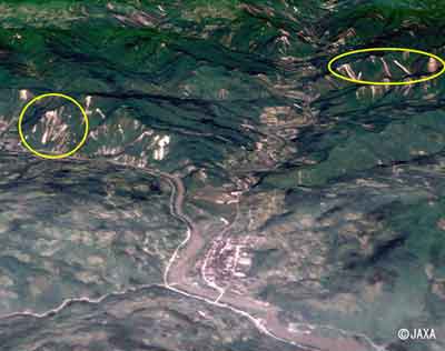 北京時間5月12日14:28,四川汶川發(fā)生里氏8級地震,日本宇宙航空研究開發(fā)機構(gòu)(JAXA)19日在其網(wǎng)站上刊登了利用陸地觀測技術(shù)衛(wèi)星(ALOS)觀測的數(shù)據(jù)圖。此次觀測的重點區(qū)域是北川縣,數(shù)據(jù)取得時間是北京時間5月18日11:49,通過圖樣對比,可以看出此次地震對北川縣的破壞情況。