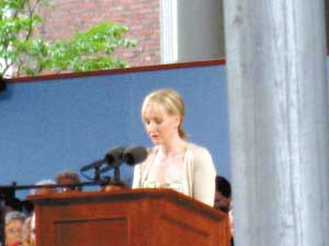 6月5日14時(shí)30分,繼上午的學(xué)位頒發(fā)儀式結(jié)束之后,哈佛大學(xué)的畢業(yè)慶典儀式繼續(xù)進(jìn)行,而其中的重頭戲就是《哈利·波特》作者J·K·羅琳的演講。盡管下著毛毛細(xì)雨,擺了兩萬多把椅子的哈佛園(Havard Yard,哈佛主校區(qū))仍然座無虛席。參加慶典的學(xué)生親友中,不乏表情雀躍的小朋友。身穿淺色花裙、外著米色外套、手握紅色坤包的羅琳甫一出現(xiàn),全場(chǎng)便一陣騷動(dòng),并響起了長時(shí)間的掌聲。