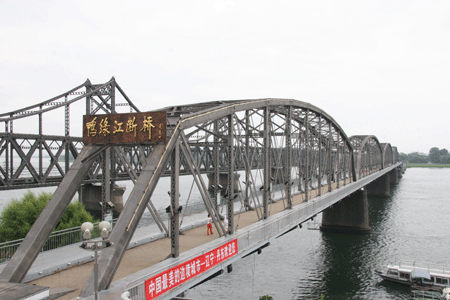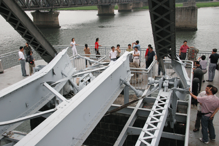 中新網(wǎng)7月2日電 7月1日,2008全國網(wǎng)絡(luò)媒體遼寧行記者采訪團(tuán)來到那曾經(jīng)戰(zhàn)火紛飛的鴨綠江斷橋參觀。鴨綠江端橋?yàn)轼喚G江上諸多橋中第一座橋,1909年5月動工,1911年10月竣工。由當(dāng)時(shí)日本朝鮮總督府鐵道局所建。始為鐵路橋,12孔,長944.2米。從中方數(shù)第4孔為開閉梁,以4號墩為軸,可旋轉(zhuǎn)90°,便于過往船只航行。