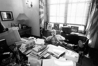 他的辦公桌面則活脫脫一間倉庫:一個貝利·高華德的搖頭公仔,一個泰迪·羅斯福的填充人偶,一個盛滿羽毛的杯子,一個帽子上寫著“軍隊”二字的綠色巫婆填充玩偶,一條刻著在伊拉克戰(zhàn)死的某士兵名字的手鐲,以及數(shù)不清的碎紙、石頭、硬幣和曲別針。粘在桌子一角的簽語餅的小紙條很容易勾起人們的回憶,上面寫著:“相比于金錢和成功,原則對你更重要。