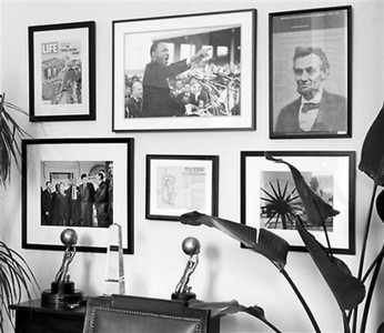 辦公室里有一面“英雄墻”,貼的都是他欽佩的歷史人物照片,其中有亞伯拉罕·林肯、甘地和他的紡車、馬丁·路德·金和約翰·F·肯尼迪。墻上還掛了一份加了外框的1963年華盛頓游行時日程安排的原始文件,金正是在那次游行過程中發(fā)表了《我有一個夢想》的演講。