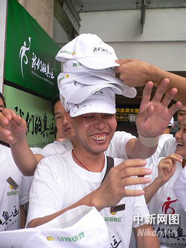 當更多的人聽說這個消息后,爭相聚攏過來,把頭上的帽子一層層戴在徐先生的頭上,上面戴不住了,又往徐先生的懷里送。外層的志愿者們眼看擠不上去,就干脆把帽子扔向徐先生。懷里抱著一堆帽子,頭上頂著幾層帽子,徐先生樂開了花。