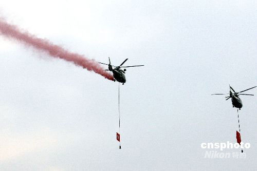 升旗儀式中,直升機(jī)懸掛國(guó)旗、區(qū)旗,噴射彩色煙火掠過金紫荊廣場(chǎng)上空。