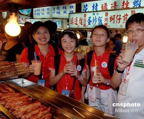 福建小營員夜游臺(tái)北“士林夜市”,品嘗當(dāng)?shù)靥厣〕。中新社發(fā) 劉可耕 攝