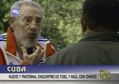 資料圖:古巴前領(lǐng)導(dǎo)人菲德爾·卡斯特羅與委內(nèi)瑞拉總統(tǒng)查韋斯會(huì)談的畫面17日出現(xiàn)在古巴電視臺(tái)上。