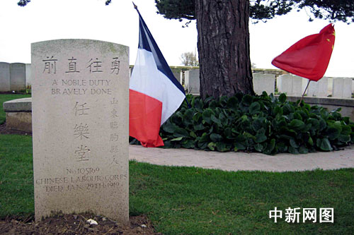 據(jù)了解,第一次世界大戰(zhàn)期間,約十四萬中國勞工遠(yuǎn)渡重洋來到歐洲前線。他們主要集中在法國北部從事戰(zhàn)地后勤的工作,如維修道路、營房,挖掘戰(zhàn)壕,裝卸彈藥,救護(hù)傷員,掩埋尸體等。一九一七年八月,中國政府正式對德宣戰(zhàn)后,部分華工加入法軍,直接參加戰(zhàn)斗。一九一八年九月至十一月,德國等同盟國先后戰(zhàn)敗投降,華工為中國爭得戰(zhàn)勝國地位立下汗馬功勞,但同時也付出了沉重代價:中國勞工中有兩萬人再也沒能踏上故鄉(xiāng)的土地,這些客死他鄉(xiāng)的中國勞工大部分安葬在法國北部諾萊特等墓園中,每個人的墓碑上都刻有中文的銘文。