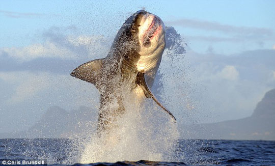 在攝影師Chris Brunskill的鏡頭中,大白鯊雖然體形碩大,捕食時(shí)卻身手矯健,縱身躍出水面6米高,張開(kāi)大嘴將它的“美食”緊緊咬在口中。