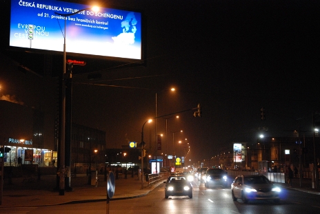 圖為捷克首都布拉格北面通向德國方向的交通要道一個(gè)路口上矗立的巨大廣告牌。設(shè)計(jì)者把捷文“穿行歐洲之路暢通無阻” 三個(gè)單詞中的字母“O” 巧妙地變成交通信號燈,而且三盞燈全是綠燈,喜悅之情躍然牌上。(黃頻)