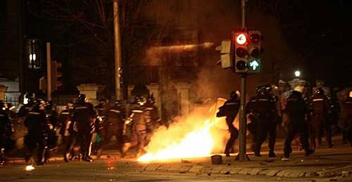據(jù)聯(lián)合早報網(wǎng)報道,大約一千名憤怒的塞族青年,到美國大使館、一間美式快餐店和歐盟輪任主席國斯洛文尼亞大使館投擲石塊,并與防暴警察沖突,示威者又拆去歐盟旗幟,示威者又縱火、燒車,打爛大使館的玻璃窗。防暴警察以催激氣體及橡膠子彈驅(qū)散,又施放催淚氣體和出動警棍驅(qū)散。