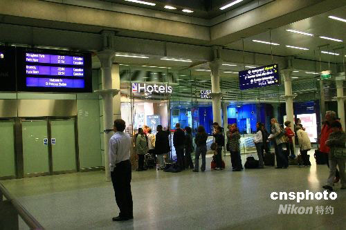 圖為11日晚,警察封鎖了歐洲之星火車的出發(fā)站臺(tái),現(xiàn)場(chǎng)有乘客焦急等候。