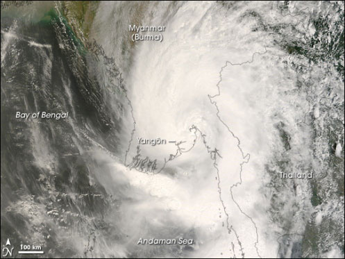 美國“今日宇宙”(universetoday)網(wǎng)站公布的衛(wèi)星照片顯示,強(qiáng)熱帶風(fēng)暴“納爾吉斯”2日開始在緬甸伊洛瓦底省海基島附近登陸,風(fēng)暴登陸時(shí)的最大風(fēng)力超過190公里。風(fēng)暴登陸后轉(zhuǎn)向緬甸三角洲地區(qū),一路掃蕩伊洛瓦底省、勃固省和仰光省,3日凌晨突然抵達(dá)仰光市中心。屬于第三級熱帶氣旋的“納爾吉斯”一路沿仰光西南約220公里的伊江江口登陸北上,沿途摧毀無數(shù)的建筑物。