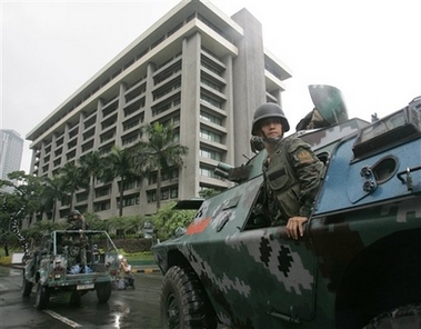 菲律賓首都馬尼拉氣氛十分緊張。菲律賓軍隊已經(jīng)攻入該酒店,目前還不清楚是否有人員傷亡。菲律賓前總統(tǒng)埃斯特拉達等人已經(jīng)發(fā)表聲明,否認與此事有關。