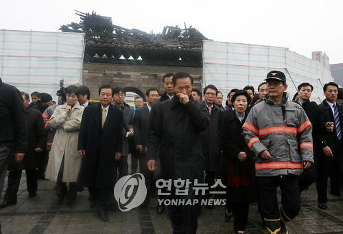 李明博視察崇禮門(mén)火災(zāi)現(xiàn)場(chǎng)表情沉重一言不發(fā)(圖)