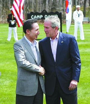 美國(guó)東部時(shí)間19日,韓國(guó)總統(tǒng)李明博與美國(guó)總統(tǒng)布什商定,在普遍價(jià)值與堅(jiān)固的信任基礎(chǔ)之上,將兩國(guó)關(guān)系提升至“21世紀(jì)戰(zhàn)略同盟關(guān)系”。