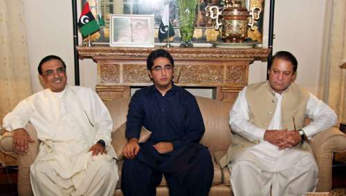 巴基斯坦執(zhí)政聯(lián)盟兩大政黨穆盟(謝里夫派)領(lǐng)導(dǎo)人謝里夫(右)和人民黨聯(lián)合主席扎爾達(dá)里(左)、比拉瓦爾(中)。