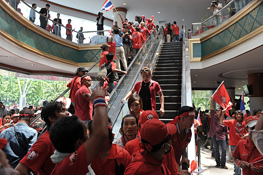 報道稱,“紅衫軍”抗議者高喊要求總理阿披實下臺的口號,他們沖破了警察封鎖,打碎玻璃門,涌入了會議中心。