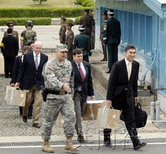 據(jù)悉,金成一行攜帶7只可能裝有有關(guān)朝鮮核開發(fā)計劃相關(guān)文件的箱子通過板門店。他們預(yù)計將在首爾向韓國外交通商省負責(zé)人通報本次訪問結(jié)果后,于12日返回美國。