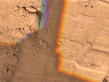 “鳳凰”號(hào)在火星表面取樣時(shí)鉆出的兩個(gè)小洞(左上角)