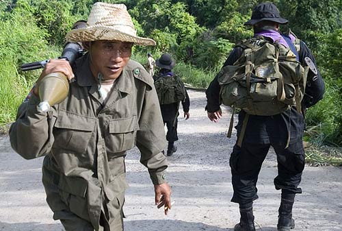 柬埔寨一名士兵攜帶一個(gè)火箭發(fā)射器與泰國(guó)的士兵擦身而過(guò)。