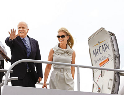 麥凱恩民望追平奧巴馬,夫婦登上專機時笑容滿面。