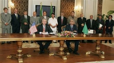 負(fù)責(zé)中東外交事務(wù)的美國(guó)助理國(guó)務(wù)卿韋爾奇與利比亞外交部美洲事務(wù)負(fù)責(zé)人費(fèi)圖里,分別代表兩國(guó)政府在協(xié)議上簽字。韋爾奇表示,這是為兩國(guó)關(guān)系開(kāi)啟新一頁(yè)的協(xié)議;費(fèi)圖里說(shuō),這是經(jīng)過(guò)漫長(zhǎng)而且筋疲力竭的談判后的成果。