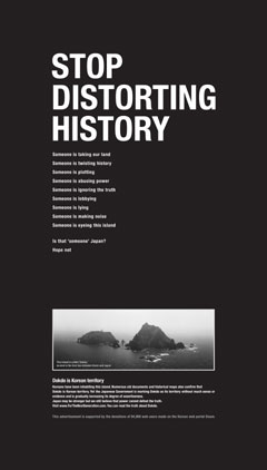 網(wǎng)民們還選定了廣告內(nèi)容。Daum從4日至12日,在網(wǎng)站公布了某廣告公司免費(fèi)制作的三個(gè)廣告試案,并征求眾網(wǎng)民意見。結(jié)果,58.6%的網(wǎng)民選擇了“STOP DISTORTING HISTORY(停止歪曲歷史)”這一廣告文案。