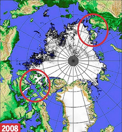西北通道(左邊圓圈)和東北通道(右上方)都已無冰塊。