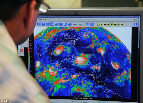 美國國家颶風中心氣象專家在查看一幅颶風衛(wèi)星照片,顯示出古斯塔夫和漢娜颶風。
