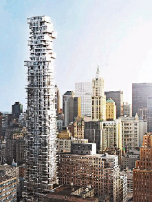 中新網(wǎng)9月15日電 為北京奧運會“鳥巢”體育館進行設計工作、受到各方贊嘆的兩位瑞士建筑設計師赫爾佐格(Jacques Herzog)和德默隆(Pierre de Meuron),將會把他們的創(chuàng)意帶到紐約。他們參與在紐約市內(nèi)興建一座透明玻璃摩天大樓。當這座建筑物在后年建成后,驟眼看好像一層層單位半浮懸在空中,令人類幻想中的“空中樓閣”活現(xiàn)眼前。