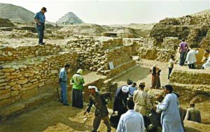 埃及考古人員在塞加拉古葬場挖掘金字塔基座。