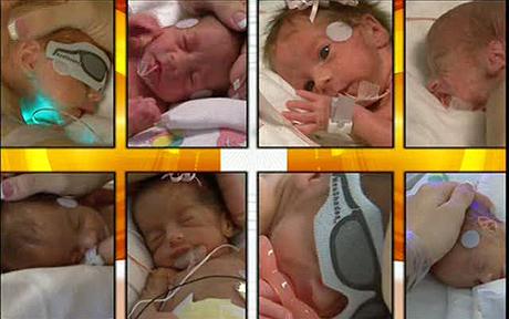 據(jù)東森新聞報(bào)道,出生至今兩個(gè)星期,八胞胎的母親娜達(dá)雅蘇利曼(Nadya Suleman)通過美國國家廣播公司的鏡頭,把孩子們一一介紹給大眾認(rèn)識(shí)。擔(dān)心自己的手太冰冷嚇到孩子,娜達(dá)雅蘇利曼還刻意把雙手搓了搓,才小心翼翼地輕輕撫摸孩子。這八胞胎都非常瘦小,身高可能都只到他們母親雙手手掌相連的長度而已。