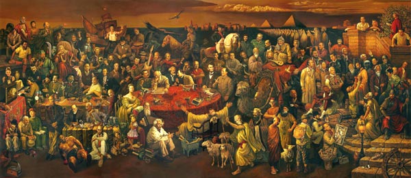 這幅油畫(huà)長(zhǎng)6米、高2.6米,繪有103位世界名人,中國(guó)的萬(wàn)里長(zhǎng)城、埃及的金字塔、英國(guó)的巨石陣等地標(biāo)作為背景出現(xiàn)在油畫(huà)中。