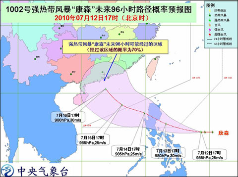 預(yù)計(jì),“康森”將以每小時(shí)20-25公里的速度向西偏北方向移動,強(qiáng)度還將有所加強(qiáng),并逐漸向菲律賓呂宋島東部一帶沿?拷,將于14日傍晚前后進(jìn)入南海東部海面。