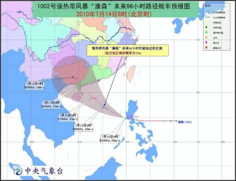 預(yù)計,“康森”將以每小時20公里左右的速度繼續(xù)向西偏北方向移動,未來有可能再次在南海海面加強為臺風(fēng),然后逐漸向廣東臺山到海南萬寧一帶沿?拷,并有可能于16日夜間到17日下午在這一帶沿海登陸。