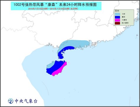 受其影響,15日晚上到16日白天,南海北部和中部、海南省及其沿海、瓊州海峽、廣東西部沿海、北部灣東部海面將有7-9級(jí)大風(fēng),“康森”中心經(jīng)過(guò)的附近海面或地區(qū)的風(fēng)力可達(dá)10-12級(jí);海南、廣東西南部將有大到暴雨,其中海南東部的部分地區(qū)有大暴雨,局地有特大暴雨。