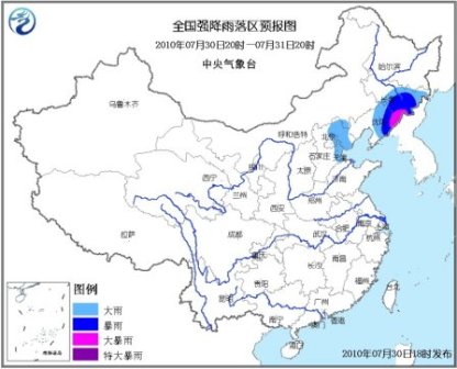 預(yù)計,7月30日20時到7月31日20時,河北東北部、京津地區(qū)東部、遼寧東部、吉林中南部等地有大雨或暴雨,其中,遼寧東部、吉林南部等地的部分地區(qū)有大暴雨;上述局地并伴有短時雷雨大風(fēng)等強(qiáng)對流天氣。