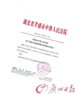 不過,馮繽還沒有等到湖北省高院是否再審的裁定,卻在7月底收到了自己的免職通知,他的助理審判員職務(wù)被孝感中院免除。