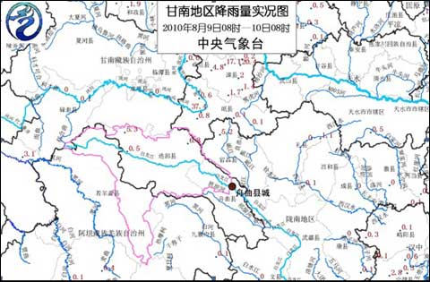 昨日08時至今日08時,除迭部縣扎尕那、臘子口及迭部出現(xiàn)5.3毫米、6.3毫米及0.5毫米降雨外,舟曲縣城及白龍江上游基本無降雨,今日08時,舟曲縣城陰,氣溫24.2℃,東南風(fēng)4米/秒。