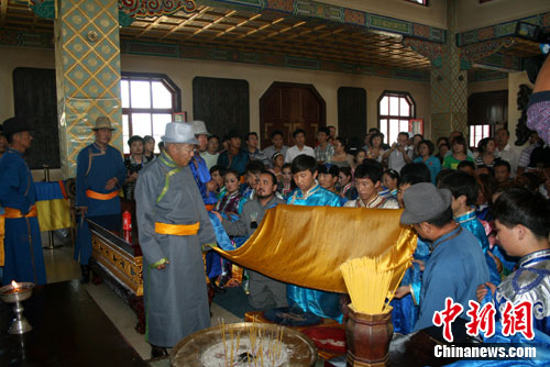 祈福儀式是在今天下午2時許開始的。在成吉思汗陵后殿供奉成吉思汗和夫人孛爾帖靈柩的靈包中,一位達爾扈特蒙古族老人手舉著延續(xù)將近800年不滅的長明燈,口誦禱文,為舟曲泥石流災區(qū)人民祈福。