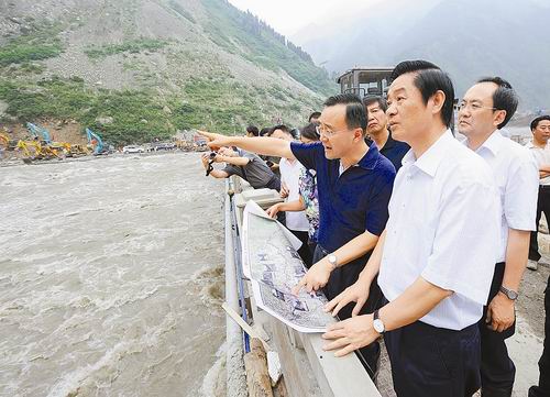 時(shí)刻關(guān)注汶川縣映秀鎮(zhèn)特大山洪泥石流災(zāi)害搶險(xiǎn)救災(zāi)工作的省委書(shū)記、省人大常委會(huì)主任劉奇葆,16日下午再次趕往映秀鎮(zhèn),指導(dǎo)搶險(xiǎn)救災(zāi)工作,強(qiáng)調(diào)要不惜一切代價(jià),加快處理岷江河道中的壅塞體,拓寬河面,加大流量,降低水位,盡快讓岷江回歸正常河道,確保映秀鎮(zhèn)安全,確保人民群眾生命安全。