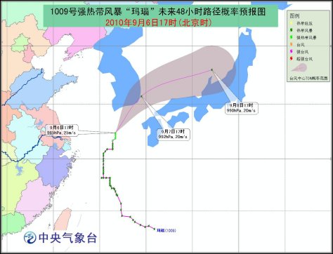 由于“瑪瑙”已遠離我國近海,對我國海區(qū)的影響趨于減弱,因此解除臺風(fēng)藍色預(yù)警。但受“瑪瑙”、西南季風(fēng)和南下冷空氣的共同影響,9月6日20時到7日20時,渤海灣、渤海海峽、黃海北部部分海域、黃海中部和南部的偏東海域、東海東北部、臺灣以東洋面將有6-8級大風(fēng),“瑪瑙”中心經(jīng)過的附近海域或地區(qū)的風(fēng)力可達9-10級,陣風(fēng)11-12級。