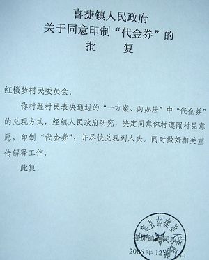 那么,村委會(huì)私自印制發(fā)行代金券的行為是否合法呢?面對記者的追問,三位村官都以沉默作答。再三追問之下,他們出示了當(dāng)?shù)劓?zhèn)政府對此做過的批示。批示上蓋有宜賓縣喜捷鎮(zhèn)人民政府的公章。批復(fù)中寫道,經(jīng)鎮(zhèn)人民政府研究,決定同意你村印制代金券。