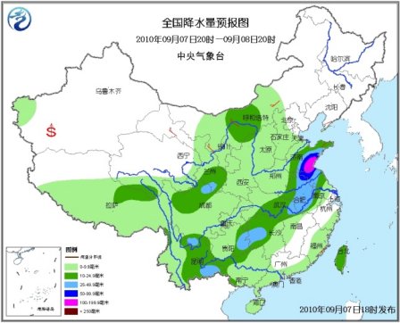 7日20時至8日20時,新疆西南部、青海南部和東部、西藏中東部、西北地區(qū)中東部、內(nèi)蒙古中部偏西地區(qū)、華北大部、黃淮、江淮、江漢、江南中西部和北部、華南大部、西南等地有小到中雨或陣雨,其中山東中南部、安徽大部、江蘇北部和西部、湖北東部、湖南中部偏西地區(qū)、貴州東部、甘肅東南部、川西高原北部、云南東南部等地有大雨或暴雨;山東東南部和江蘇北部的局部地區(qū)有大暴雨;上述部分地區(qū)并伴有短時雷雨大風等強對流天氣。內(nèi)蒙古中西部有4~6級風;南疆盆地的部分地區(qū)有揚沙或浮塵天氣。臺灣海峽有5~7級東北風;臺灣以東洋面有6~8級大風;臺灣以南海域有5~7級旋轉(zhuǎn)風;南海東北部海域?qū)⒂?~7級偏西風。另外,渤海、渤海海峽將有5~7級、陣風8級的東北風。
