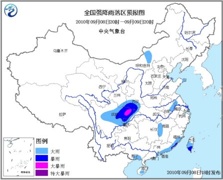 中新網9月8 日電 據中央氣象臺網站消息,中央氣象臺9月8日18時發(fā)布暴雨藍色預警:9月8日20時到9日20時,四川盆地、川西高原中部、甘肅東南部、陜西南部、重慶西部和北部、福建東南部沿海、廣東中東部沿海、臺灣中南部等地有大雨或暴雨,其中,四川盆地東北部局地有大暴雨。另外,內蒙古中部、山東半島東部、蘇皖中部、江西西部、廣西東南部、海南南部等地的部分地區(qū)有大雨。上述局部地區(qū)并伴有短時雷雨大風或冰雹等強對流天氣。