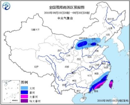 9月19日20時到20日20時,福建大部、浙江南部、江西東南部、廣東中東部、臺灣等地將有大到暴雨,福建東南部、廣東東部、臺灣等地的部分地區(qū)有大暴雨,局地有特大暴雨。