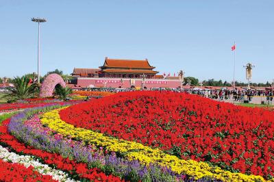 一場(chǎng)秋雨過(guò)后,北京天空分外湛藍(lán)。今年主題為“花開(kāi)盛世”。天安門(mén)廣場(chǎng)中心呈現(xiàn)出一朵巨型立體“牡丹”;▔行囊廊槐A魝鹘y(tǒng)的中心噴泉景觀,演繹出直徑50米“盛世牡丹”的造型。東西兩側(cè)綠地對(duì)稱(chēng)布置現(xiàn)代、簡(jiǎn)潔、艷麗的大色帶,并點(diǎn)綴有高低起伏、五色斑斕的花島。