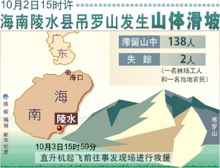吊羅山區(qū)于2日15時發(fā)生山體滑坡事件,125名游客和13名吊羅山林業(yè)局工作人員被滯留山中。海南省和陵水縣有關部門原定于4日上午根據(jù)天氣變化情況擇機開展救援行動。