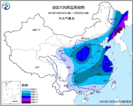 預計,10月24日14時至26日14時,西北地區(qū)中東部、內蒙古南部、東北、華北、黃淮、江淮、江漢、江南、華南大部、西南地區(qū)中東部等地將出現6~12℃降溫,其中,黑龍江東南部、吉林東部、遼寧東部等地的部分地區(qū)降溫幅度可達14~16℃;上述北方大部地區(qū)伴有5~7級,南方有4~6級偏北風。甘肅中部、青海中東部、寧夏、陜西北部等地將有雨夾雪或小到中雪,局地有大雪。