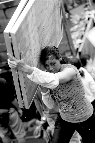 羅炳輝將軍廣場是彝良最大的災(zāi)民安置點之一,2000名受災(zāi)群眾集中安置在百余個帳篷內(nèi)。50多歲的毛振強(qiáng)和老伴帶著兩個孫子一起住在帳篷里。前天夜間,他和安置點的其他人一樣,被大風(fēng)和暴雨擾得睡不著覺。昨天凌晨1點左右,廣場上開始積水,很快水就漫過薄薄的紙板,被褥衣物都洇濕了!拔覀冓s緊把東西收拾起來,就這么站了一夜沒能睡覺。”由于帳篷內(nèi)物品進(jìn)水,昨天白天,安置點內(nèi)的很多災(zāi)民連坐的地方都沒有,蹲在地上吃飯,也沒法睡覺。